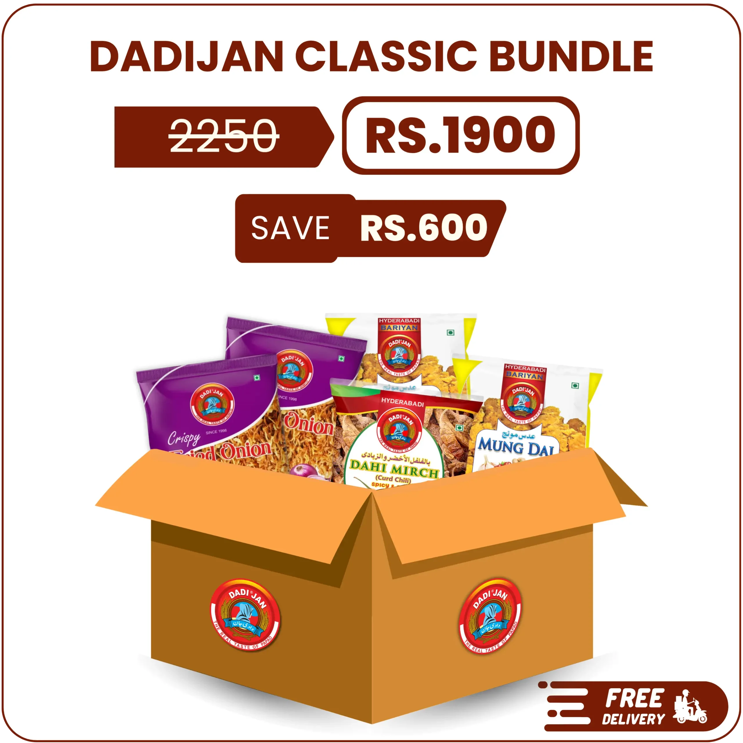 Dadijan classic bundle brings authentic desi taste to your kitchen. it includes hyderabadi bariyan, crispy fried onions and flavorful dahi mirch.