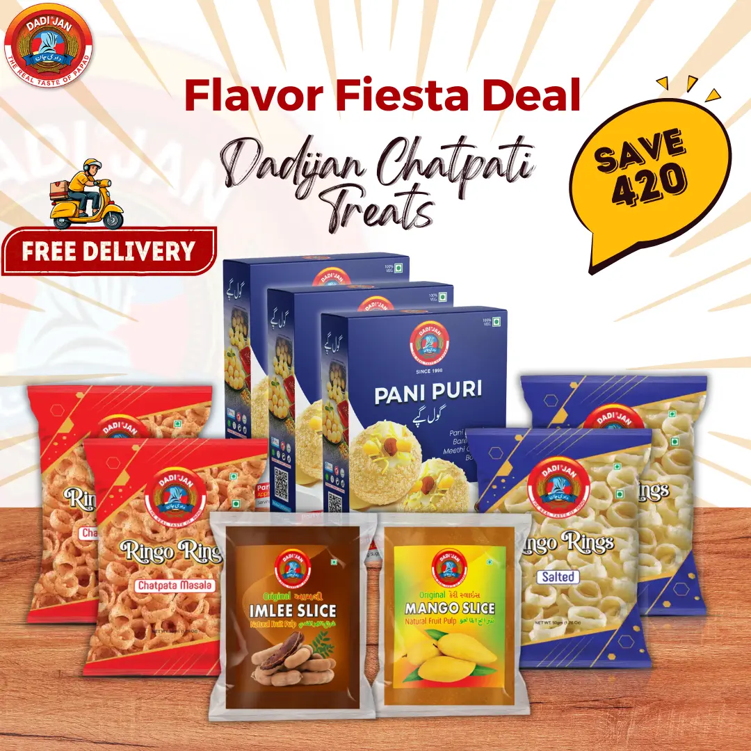 This pack contains Pani Puri, Ringo Ring Salted, Ringo Ring Masala, Imli Slice, and Mango Slice.