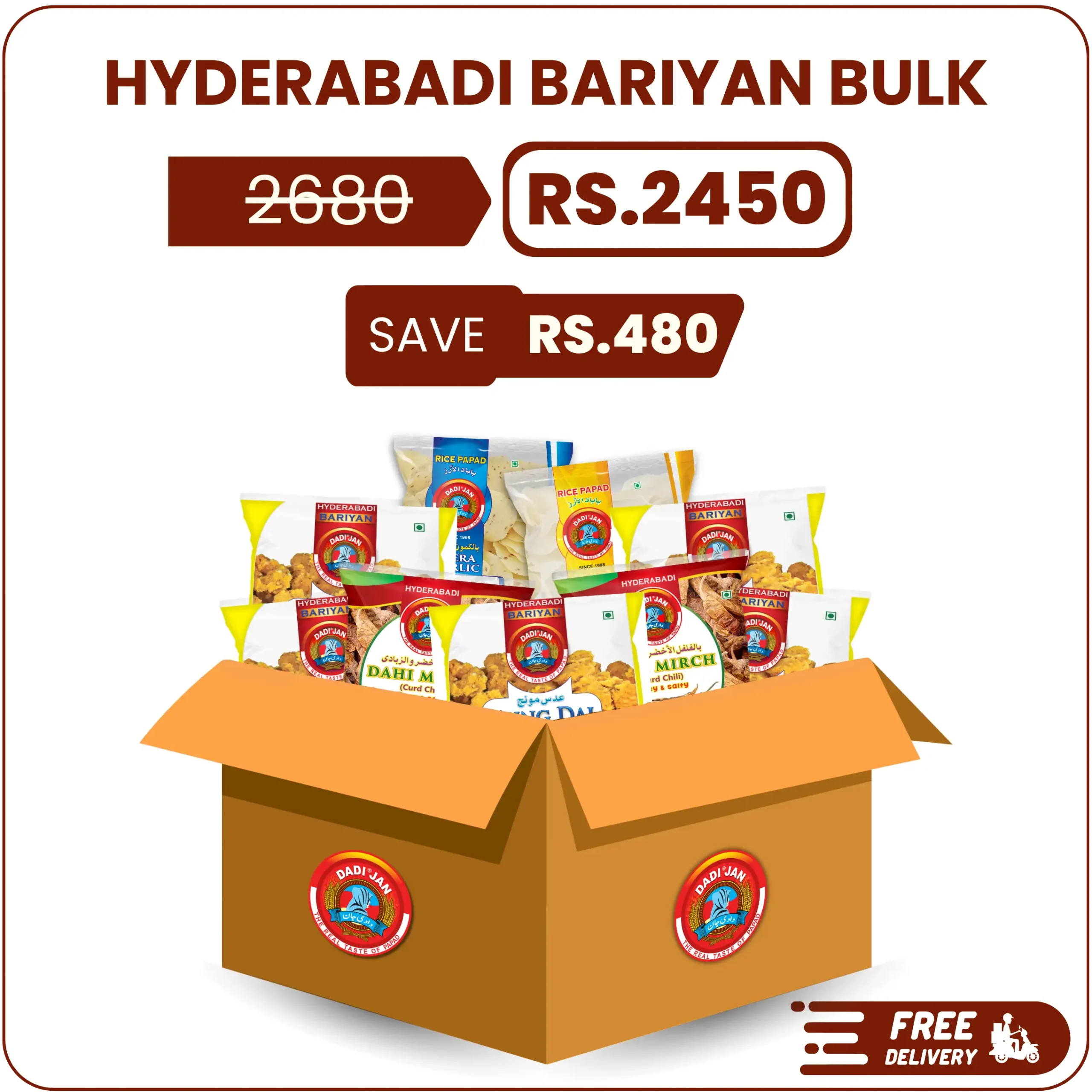 Hyderabadi bariyan bulk pakistan gives you a rich and traditional cooking experience. it includes bariyan, dahi mirch and rice papad in one convenient pack.