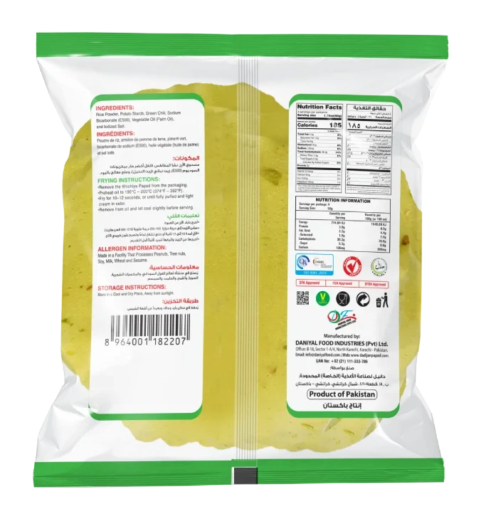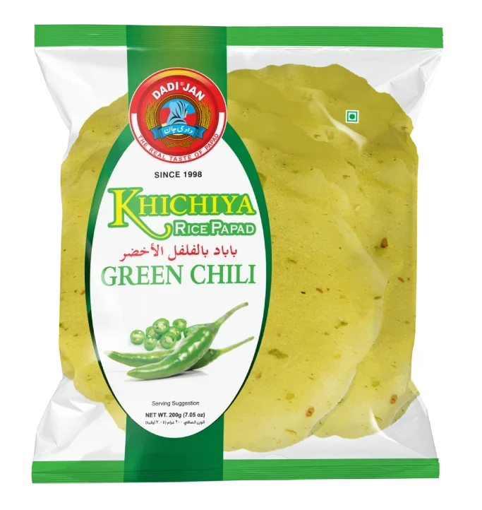 Khichiya Rice Papad Green Chili Blending of Green chili with Khichiya Papad makes it an utterly scrumptious snack with a crunchy texture. Topped with Green Chili, chopped Tomatoes, onions, coriander, and Chat Masala, papad will become an extremely mouthwatering snack. check out our full range of Khichiya Rice Papad.