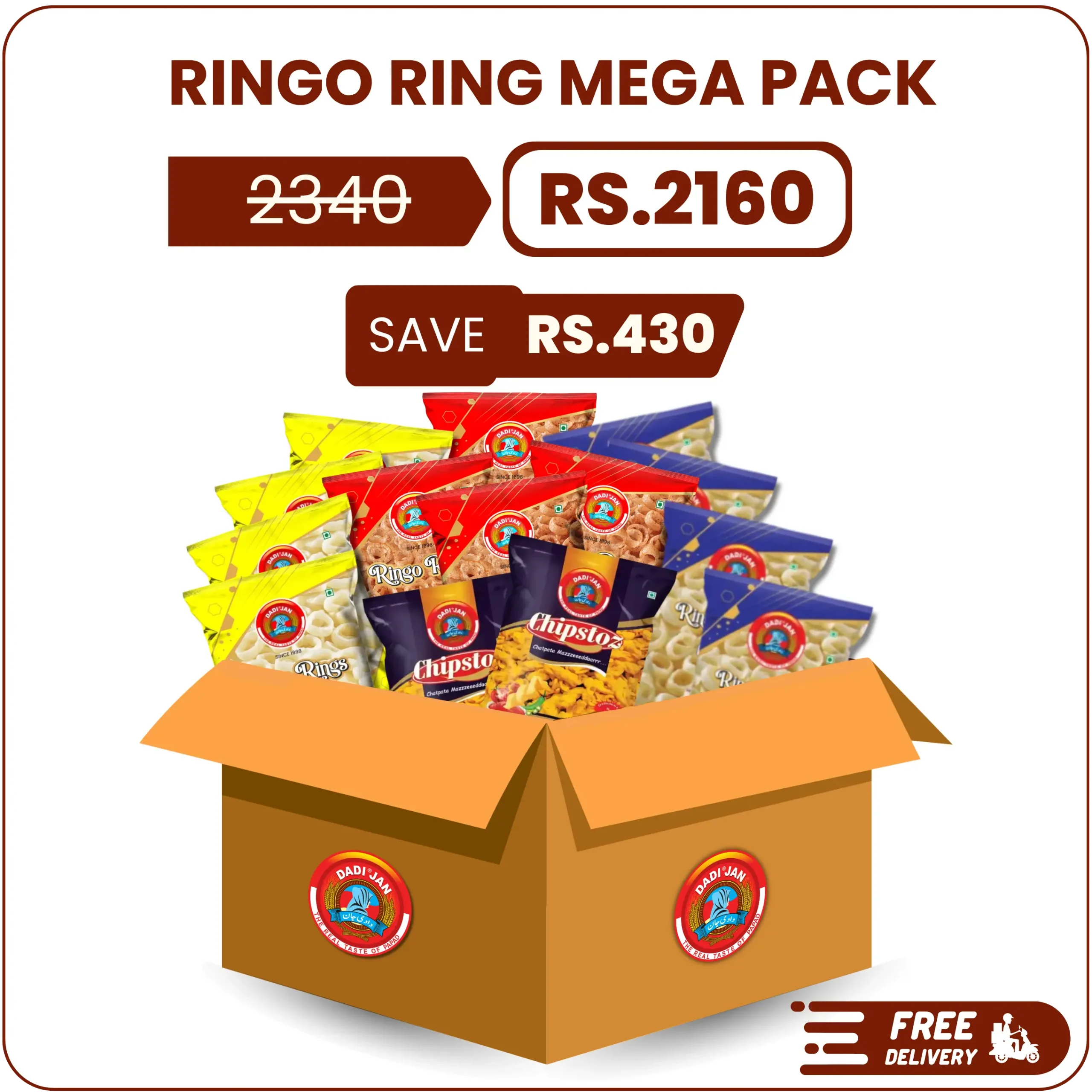 Ringo ring mega pack is the ultimate choice for snack lovers who enjoy bold flavors and extra crunch. this bundle includes a generous quantity of ringo rings in chicken, salted and chatpata masala flavors along with crispy chipstoz for added variety.