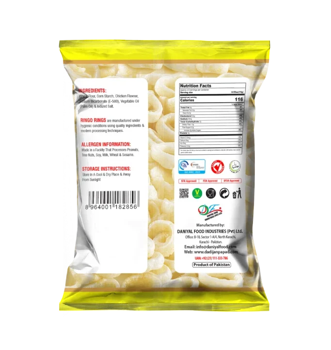 Ringo rings chicken flavour is an unavoidable option for snack lovers due to its fine quality, bold chicken taste, and tempting aroma. its crunchiness and enticing flavor make it a mouthwatering snack. the chicken flavour crunch of ringo rings perfectly satisfies slight hunger pangs.