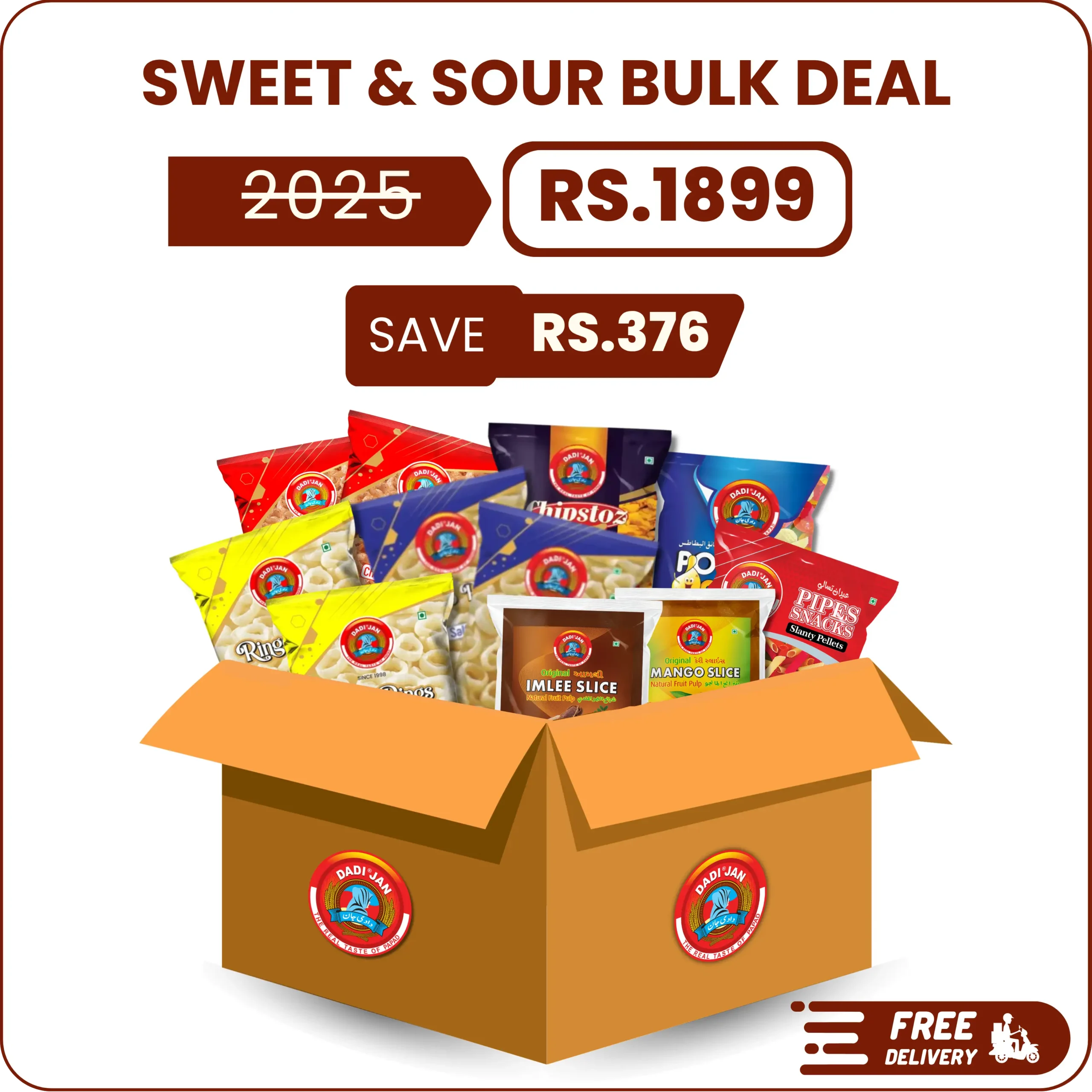Sweet & sour bulk deal is a perfect combination of tangy, sweet and crunchy snacks designed for ultimate snacking satisfaction. this bundle includes delicious mango and imlee slices along with a variety of crispy snacks like chipstoz, gol gappa chips, pipes and ringo rings.